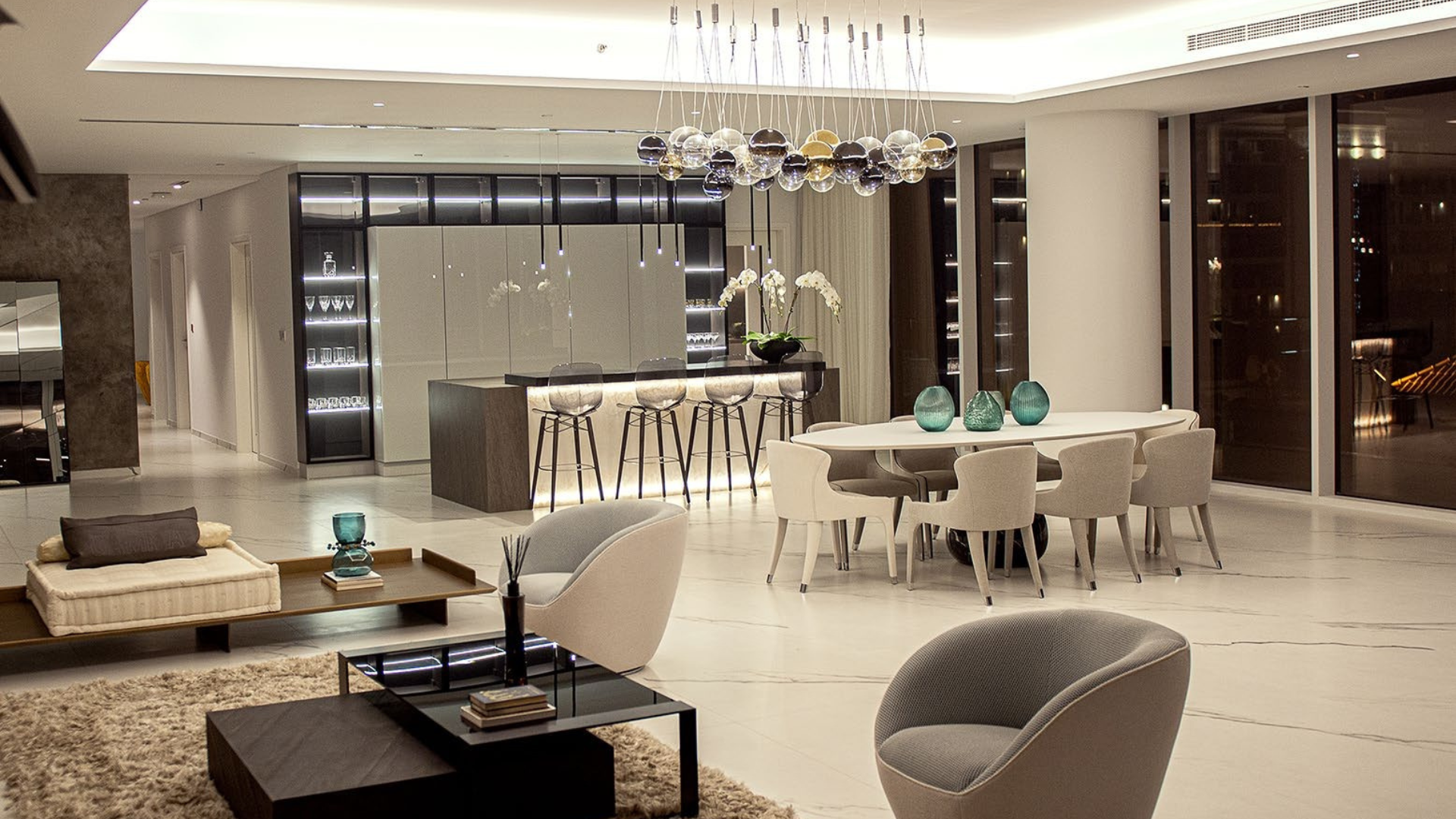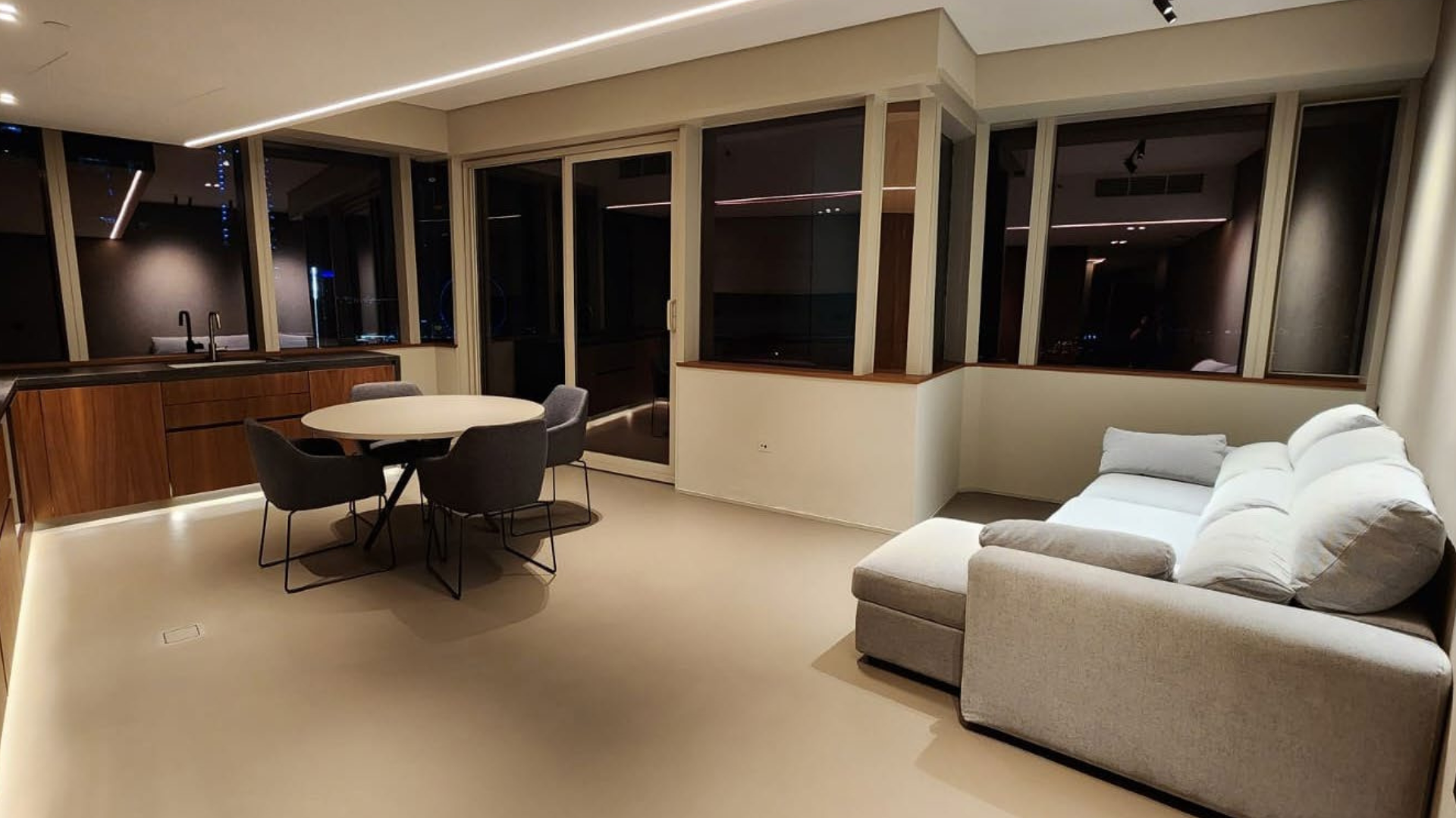 A sophisticated open-plan living area featuring ambient and accent lighting with automated controls, fostering a seamlessly adaptable and elegant atmosphere