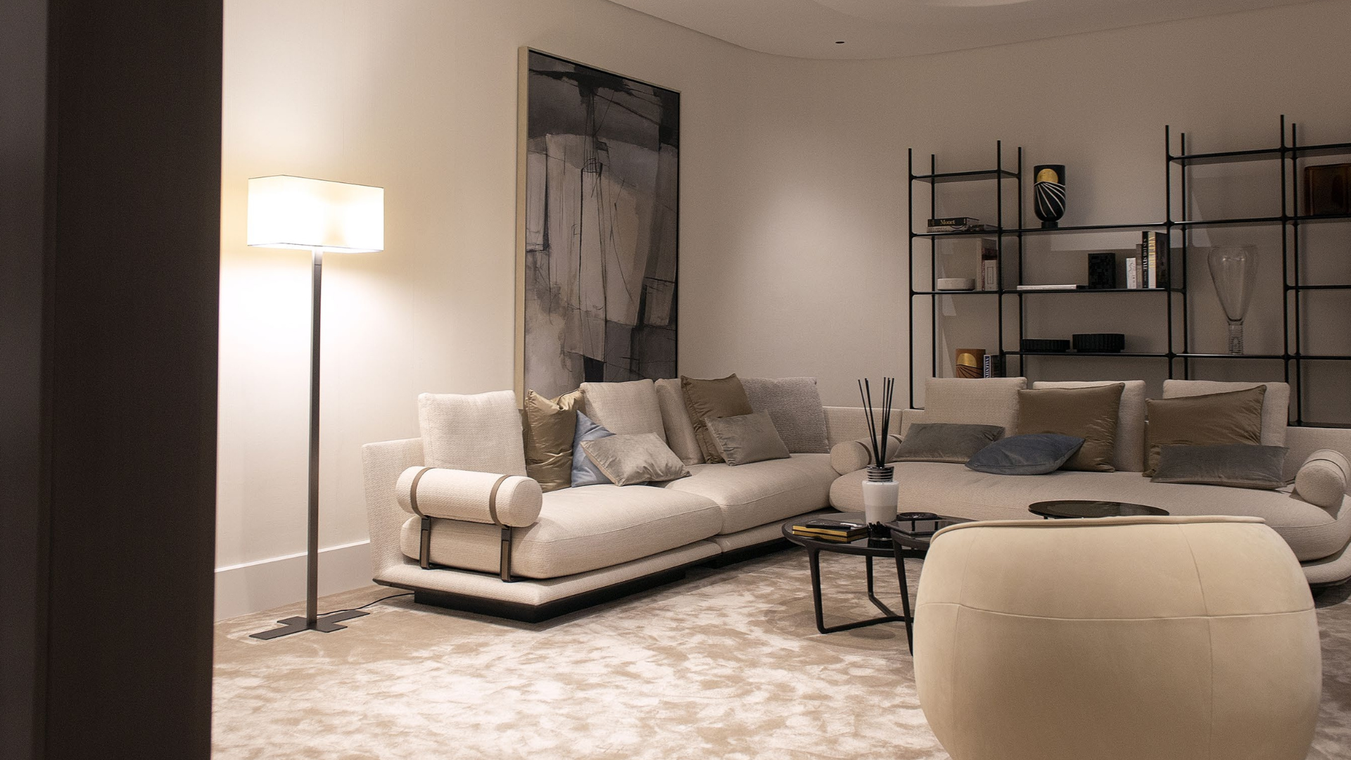 An elegant sales centre designed with sophisticated lighting, automated controls, and integrated audiovisual elements, creating a welcoming and immersive client experience